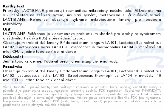 Přípravky LACTIBIANE podporují rozmanitost mikrobioty našeho těla. Mikrobiota má vliv například na zažívací sytém, imunitní systém, metabolismus, či duševní zdraví. LACTIBIANE Référence obsahuje vybrané mikrobiotické kmeny pro podporu mikrobioty.