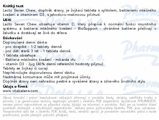 Lacto Seven Chew, doplněk stravy, je žvýkací tableta s xylitolem, bakteriemi mléčného kvašení a vitamínem D3, s jahodovo-malinovou příchutí.