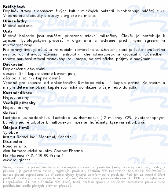 Doplněk stravy s obsahem živých kultur mléčných bakterií. Neobsahuje mléčný cukr. Vhodné pro diabetiky a osoby alergické na mléko.