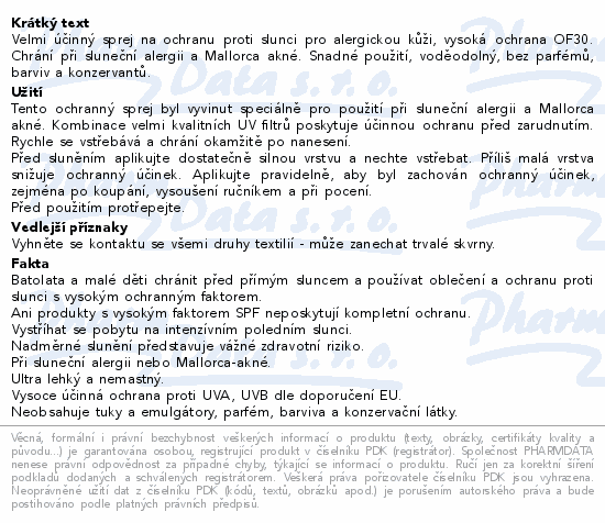Velmi účinný sprej na ochranu proti slunci pro alergickou kůži, vysoká ochrana OF30. Chrání při sluneční alergii a Mallorca akné. Snadné použití, voděodolný, bez parfémů, barviv a konzervantů.