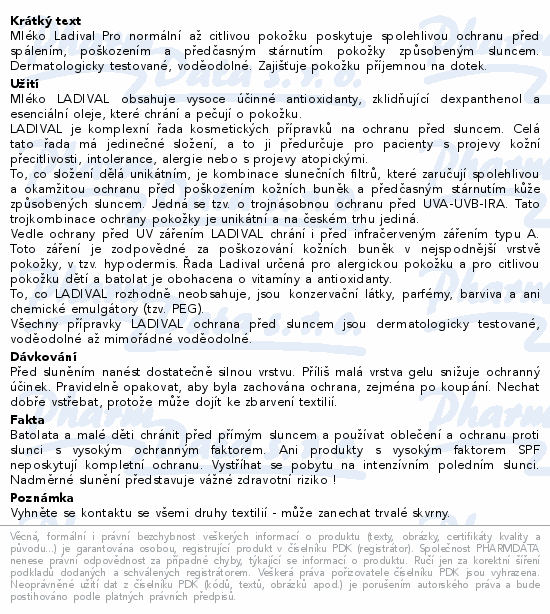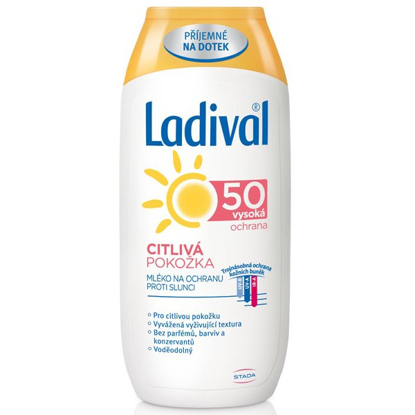 Mléko Ladival Pro normální až citlivou pokožku poskytuje spolehlivou ochranu před spálením, poškozením a předčasným stárnutím pokožky způsobeným sluncem. Dermatologicky testované, voděodolné. Zajišťuje pokožku příjemnou na dotek.