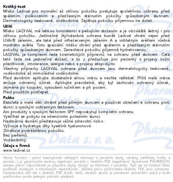 Mléko Ladival pro normální až citlivou pokožku poskytuje spolehlivou ochranu před spálením, poškozením a předčasným stárnutím pokožky způsobeným sluncem. Dermatologicky testované, voděodolné. Zajišťuje pokožku příjemnou na dotek.