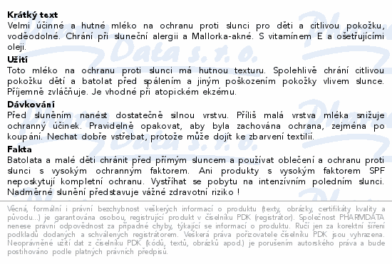 Velmi účinné a hutné mléko na ochranu proti slunci pro děti a citlivou pokožku, voděodolné. Chrání při sluneční alergii a Mallorka-akné. S vitamínem E a ošetřujícími oleji.