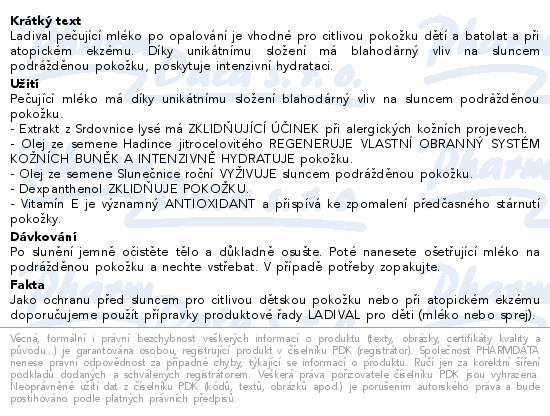 Ladival pečující mléko po opalování je vhodné pro citlivou pokožku dětí a batolat a při atopickém ekzému. Díky unikátnímu složení má blahodárný vliv na sluncem podrážděnou pokožku, poskytuje intenzivní hydrataci.
