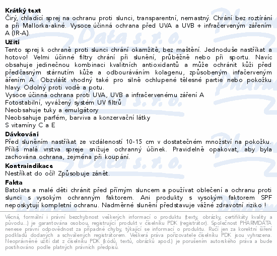 Čirý, chladící sprej na ochranu proti slunci, transparentní, nemastný. Chrání bez roztírání a při Mallorka-akné. Vysoce účinná ochrana před UVA a UVB + infračerveným zářením A (IR-A).