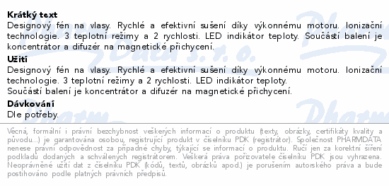 Designový fén na vlasy. Rychlé a efektivní sušení díky výkonnému motoru. Ionizační technologie. 3 teplotní režimy a 2 rychlosti. LED indikátor teploty. Součástí balení je koncentrátor a difuzér na magnetické přichycení.
