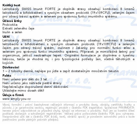 Laktobacily SWISS Imunit FORTE je doplněk stravy obsahují kombinaci 8 kmenů laktobacilů a bifidobakterií s vysokým obsahem probiotik (19x109CFU), zeleným čajem pro zdravý trávicí systém a selenem pro správnou funkci imunitního systému.