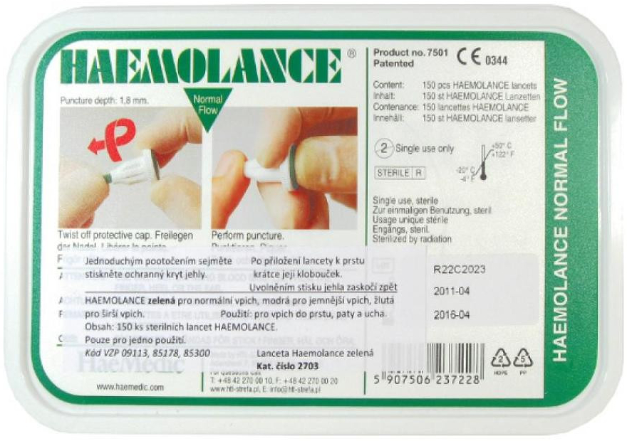 Jednorázové sterilní lancety Haemolance jsou určeny pro kapilární odběr krve bez aplikátoru. Výrobek je určen pro dospělé lidi a je možné ho dále použít k testování CRP, glukózy a INR.