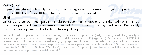 Polymethakrylátové lancety k diagnóze alergických onemocnění (kožní prick test). Sterilní. 100 blistrů po 10 lancetách k jednorázovému použití.