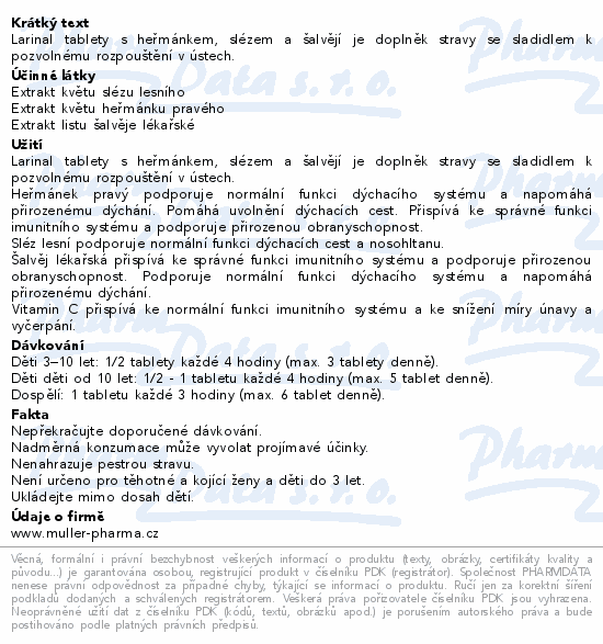 Larinal tablety s heřmánkem, slézem a šalvějí je doplněk stravy se sladidlem k pozvolnému rozpouštění v ústech.