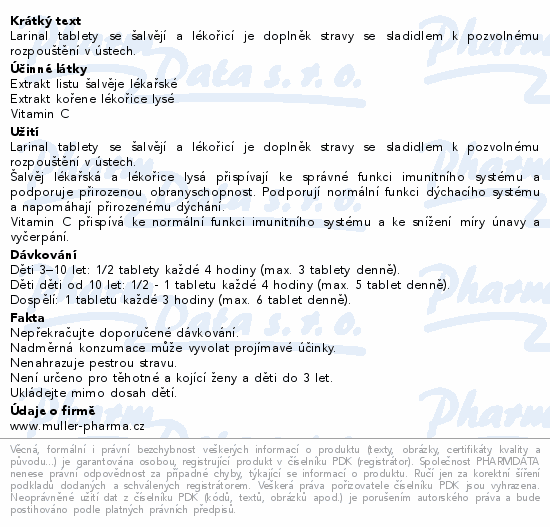 Larinal tablety se šalvějí a lékořicí je doplněk stravy se sladidlem k pozvolnému rozpouštění v ústech.
