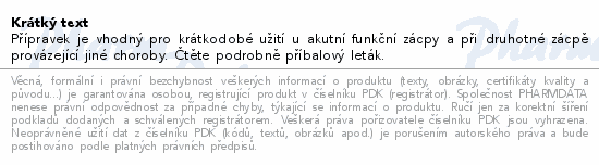 Přípravek je vhodný pro krátkodobé užití u akutní funkční zácpy a při druhotné zácpě provázející jiné choroby. Čtěte pozorně příbalový leták.