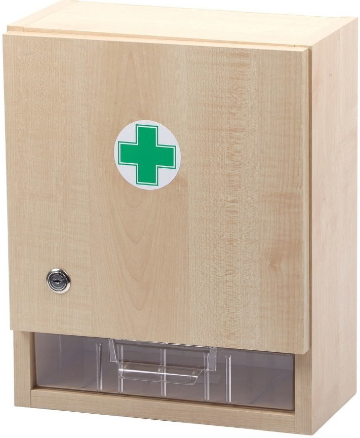 Nástěnná lékárnička prázdná slouží jako úschovna pro prostředky první pomoci do kanceláří, škol, provozoven a domácností. Skříňka je uzamykatelná. Montážní materiál součástí. Rozměr: 33x23x12 cm.
