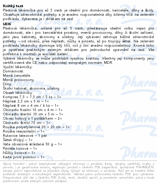 Plastová lékárnička pro až 5 osob je ideální pro domácnosti, kanceláře, dílny a školy. Obsahuje zdravotnické potřeby a je snadno rozpoznatelná díky bílému kříži na zeleném podkladu. Vybavena je i držákem na zeď.