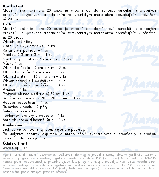 Mobilní lékárnička pro 20 osob je vhodná do domácností, kanceláří a drobných provozů. Je vybavena standardním zdravotnickým materiálem dostačujícím k ošetření až 20 osob.