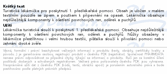 Turistická lékárnička pro poskytnutí 1. předlékařské pomoci. Obsah je uložen v malém textilním pouzdře se zipem a poutkem k připevnění na opasek. Lékárnička obsahuje nejdůležitější komponenty k ošetření povrchových ran, oděrek a puchýřů.