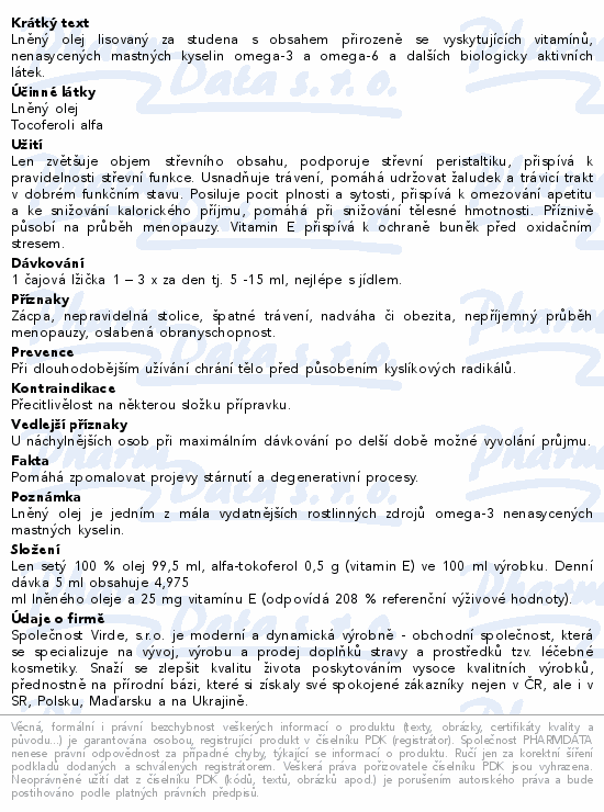 Lněný olej lisovaný za studena s obsahem přirozeně se vyskytujících vitamínů, nenasycených mastných kyselin omega-3 a omega-6 a dalších biologicky aktivních látek.