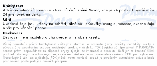 Advěntní kalendář obsahuje 24 druhů čajů s vůní Vánoc, kde je 24 postav k vystřižení a 24 jmenovek na dárky.