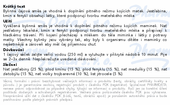 Bylinná čajová směs je vhodná k doplnění pitného režimu kojících matek. Jestřabina, kmín a fenykl obsahují látky, které podporují tvorbu mateřského mléka.