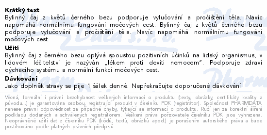 Bylinný čaj z květů černého bezu podporuje vylučování a pročištění těla. Navíc napomáhá normálnímu fungování močových cest. Bylinný čaj z květů černého bezu podporuje vylučování a pročištění těla. Navíc napomáhá normálnímu fungování močových cest.