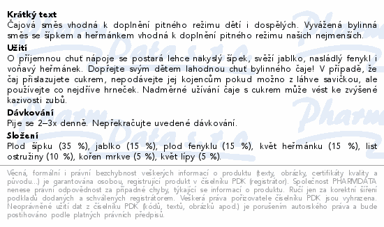 Čajová směs vhodná k doplnění pitného režimu dětí i dospělých. Vyvážená bylinná směs se šípkem a heřmánkem vhodná k doplnění pitného režimu našich nejmenších.