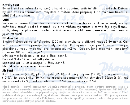 Bylinná směs s heřmánkem, který přispívá k dobrému zažívání dětí i dospělých. Dětská bylinná směs s heřmánkem, fenyklem a mátou, které přispívají k normálnímu trávení a přináší klid v bříšku.