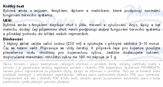 Bylinná směs s anýzem, fenyklem, šípkem a maliníkem, které podporují normální fungování trávicího systému.