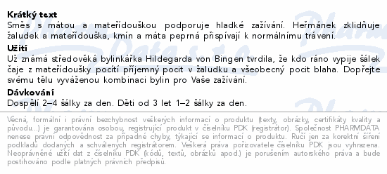 Směs s mátou a mateřídouškou podporuje hladké zažívání. Heřmánek zklidňuje žaludek a mateřídouška, kmín a máta peprná přispívají k normálnímu trávení.