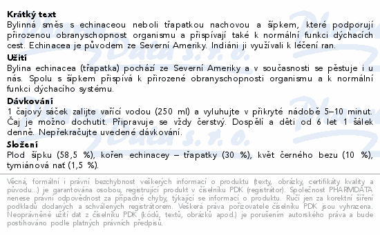 Bylinná směs s echinaceou neboli třapatkou nachovou a šípkem, které podporují přirozenou obranyschopnost organismu a přispívají také k normální funkci dýchacích cest. Echinacea je původem ze Severní Ameriky. Indiáni ji využívali k léčení ran.