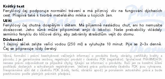 Fenyklový čaj podporuje normální trávení a má příznivý vliv na fungování dýchacích cest. Přispívá také k tvorbě mateřského mléka u kojících žen.