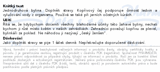 Jednodruhová bylina. Doplněk stravy. Kopřivový čaj podporuje činnost ledvin a vylučování vody z organismu. Používá se také při jarních očistných kúrách.