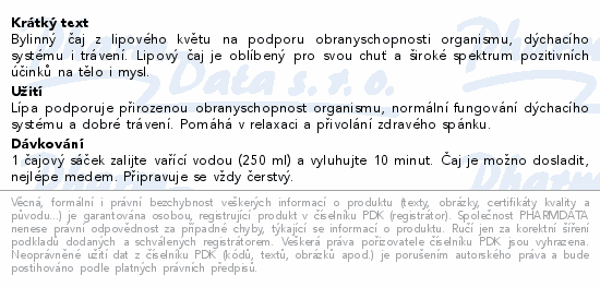 Bylinný čaj z lipového květu na podporu obranyschopnosti organismu, dýchacího systému i trávení. Lipový čaj je oblíbený pro svou chuť a široké spektrum pozitivních účinků na tělo i mysl.