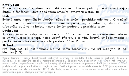 21 denní čajová kůra, která napomáhá navození duševní pohody. Jarní bylinný čaj s šantou a ženšenem, která dodá vašim emocím rovnováhu a stabilitu.
