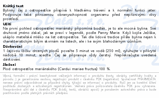 Bylinný čaj z ostropestřce přispívá k hladkému trávení a k normální funkci jater. Podporuje také přirozenou obranyschopnost organismu před nepříznivými vlivy prostředí.