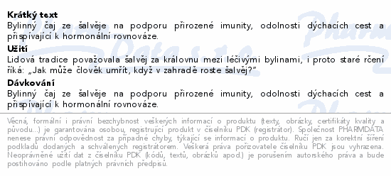 Bylinný čaj ze šalvěje na podporu přirozené imunity, odolnosti dýchacích cest a přispívající k hormonální rovnováze.