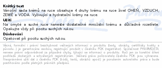 Vánoční sada krémů na ruce obsahuje 4 druhy krému na ruce živel OHEŇ, VZDUCH, ZEMĚ a VODA. Vyživující a hydratační krémy na ruce.