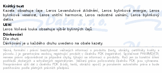 Kazeta obsahuje čaje :Leros Levandulové zklidnění, Leros bylinková energie, Leros bylinková veselost, Leros vnitřní harmonie, Leros radostné usínání, Leros bylinkový detox.