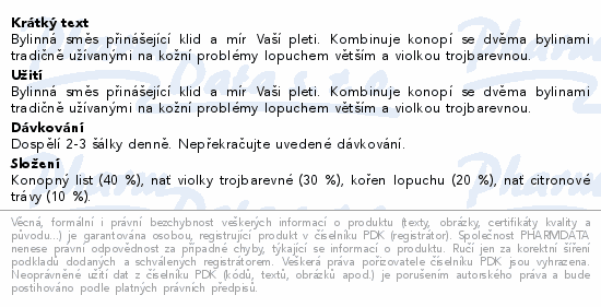 Bylinná směs přinášející klid a mír Vaší pleti. Kombinuje konopí se dvěma bylinami tradičně užívanými na kožní problémy lopuchem větším a violkou trojbarevnou.