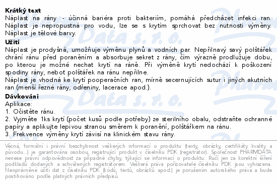 Náplast na rány - účinná bariéra proti bakteriím, pomáhá předcházet infekci ran. Náplast je nepropustná pro vodu, lze se s krytím sprchovat bez nutnosti výměny. Náplast je tělové barvy.