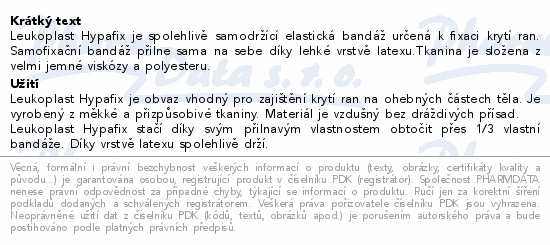 Leukoplast Hypafix je spolehlivě samodržící elastická bandáž určená k fixaci krytí ran. Samofixační bandáž přilne sama na sebe díky lehké vrstvě latexu.Tkanina je složena z velmi jemné viskózy a polyesteru.