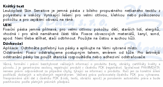 Leukoplast Skin Sensitive je jemná páska z bílého propustného netkaného textilu z polyesteru a viskózy. Vynikající řešení pro velmi citlivou, křehkou nebo poškozenou pokožku a pro zajištění obvazů na ráně.