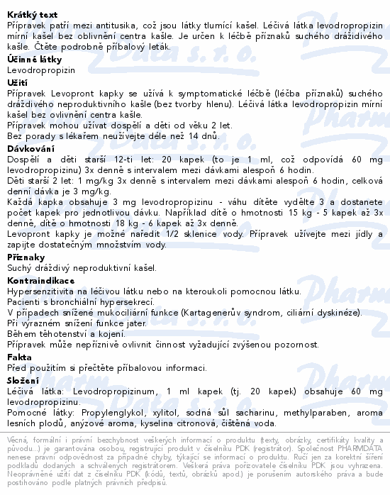 Přípravek je určen na suchý dráždivý neproduktivní kašel. Přípravek Levopront kapky patří mezi antitusika, což jsou látky tlumící kašel.