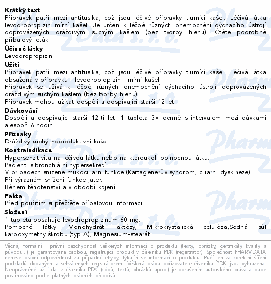 Přípravek patří mezi antitusika, což jsou léčivé přípravky tlumící kašel. Léčivá látka levodropropizin mírní kašel. Je určen k léčbě různých onemocnění dýchacího ústrojí doprovázených dráždivým suchým kašlem (bez tvorby hlenu). Čtěte pozorně příbalový leták.