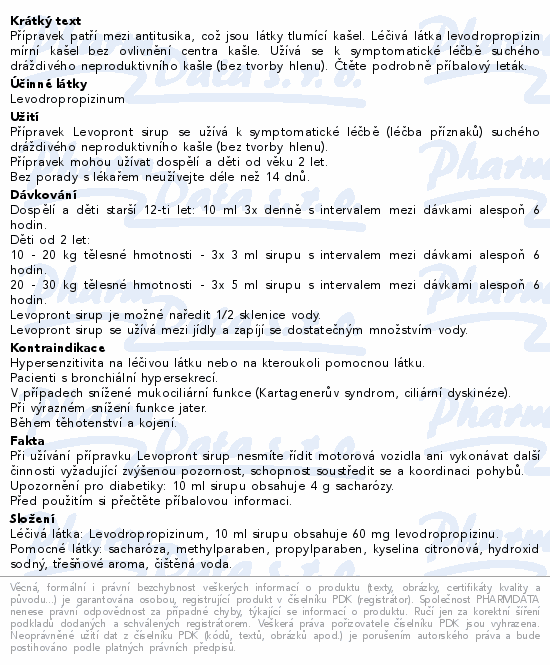 Přípravek Levopront sirup patří mezi antitusika, což jsou látky tlumící kašel. Přípravek je určen na suchý dráždivý neproduktivní kašel. Sirup má příchuť třešně a je určené nejen pro dospělé, ale i pro děti od 2 let. Vhodné i pro alergiky.