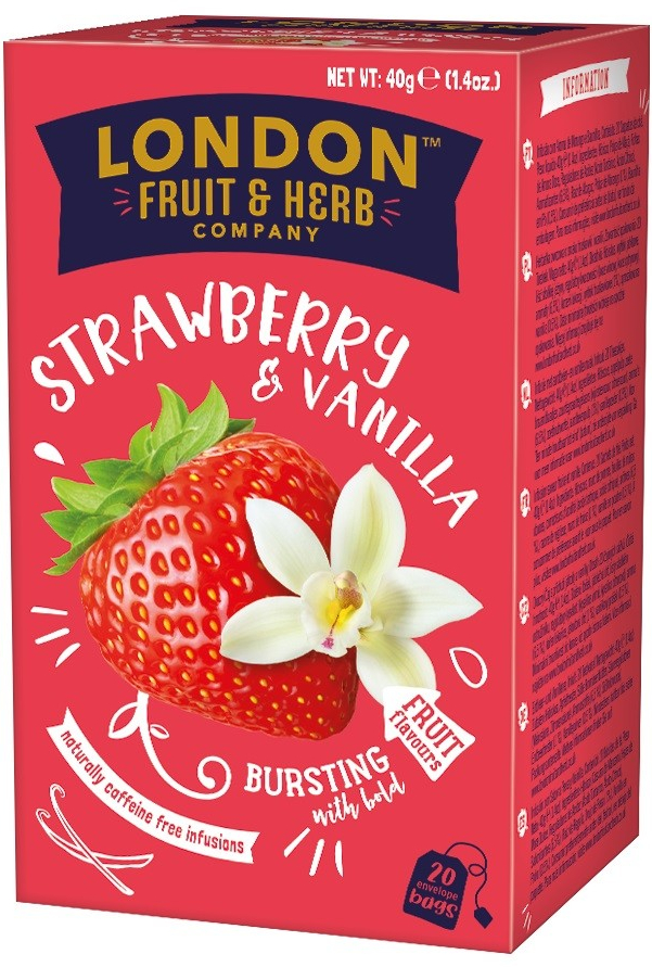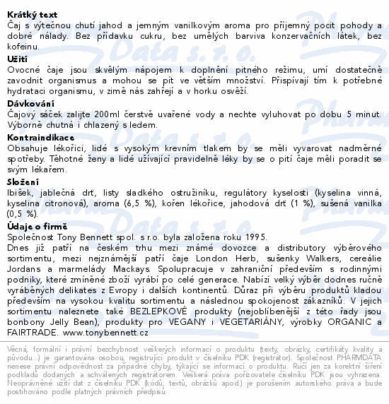 Čaj s výtečnou chutí jahod a jemným vanilkovým aroma pro příjemný pocit pohody a dobré nálady. Bez přídavku cukru, bez umělých barviva konzervačních látek, bez kofeinu.