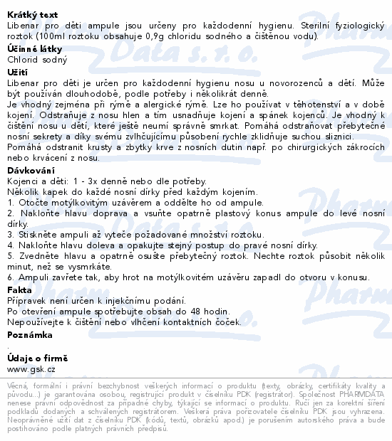 Libenar pro děti ampule jsou určeny pro každodenní hygienu. Sterilní fyziologický roztok (100ml roztoku obsahuje 0,9g chloridu sodného a čištěnou vodu).