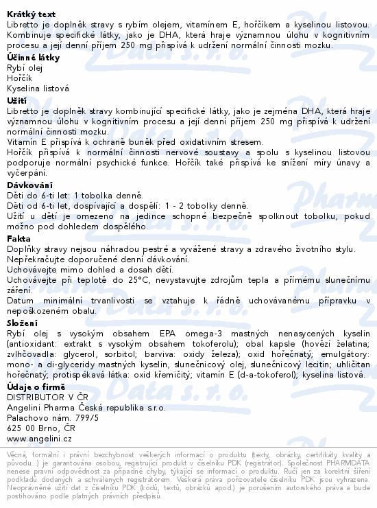 Libretto je doplněk stravy s rybím olejem, vitamínem E, hořčíkem a kyselinou listovou. Kombinuje specifické látky, jako je DHA, která hraje významnou úlohu v kognitivním procesu a její denní příjem 250 mg přispívá k udržení normální činnosti mozku.