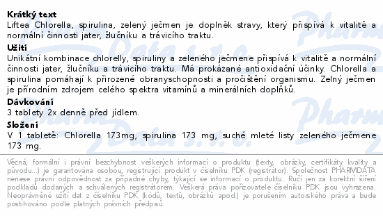 Liftea Chlorella, spirulina, zelený ječmen je doplněk stravy, který přispívá k vitalitě a normální činnosti jater, žlučníku a trávicího traktu.