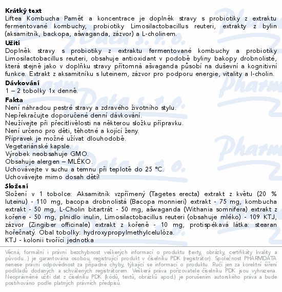 Liftea Kombucha Paměť a koncentrace je doplněk stravy s probiotiky z extraktu fermentované kombuchy, probiotiky Limosilactobacillus reuteri, extrakty z bylin (aksamitník, backopa, ašwaganda, zázvor) a L-cholinem.