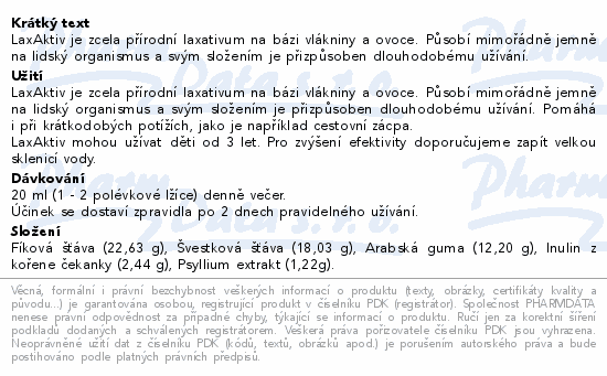 LaxAktiv je zcela přírodní laxativum na bázi vlákniny a ovoce. Působí mimořádně jemně na lidský organismus a svým složením je přizpůsoben dlouhodobému užívání.